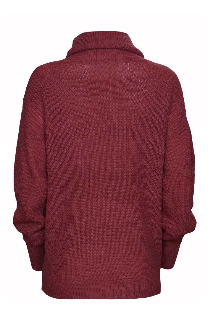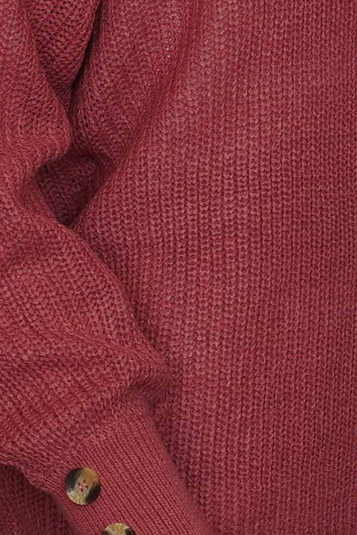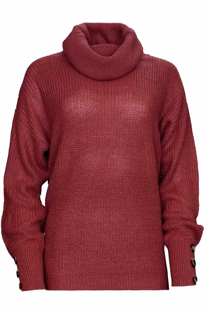 Turtleneck sweater with overlapping collar and decorative buttons on the sleeve.